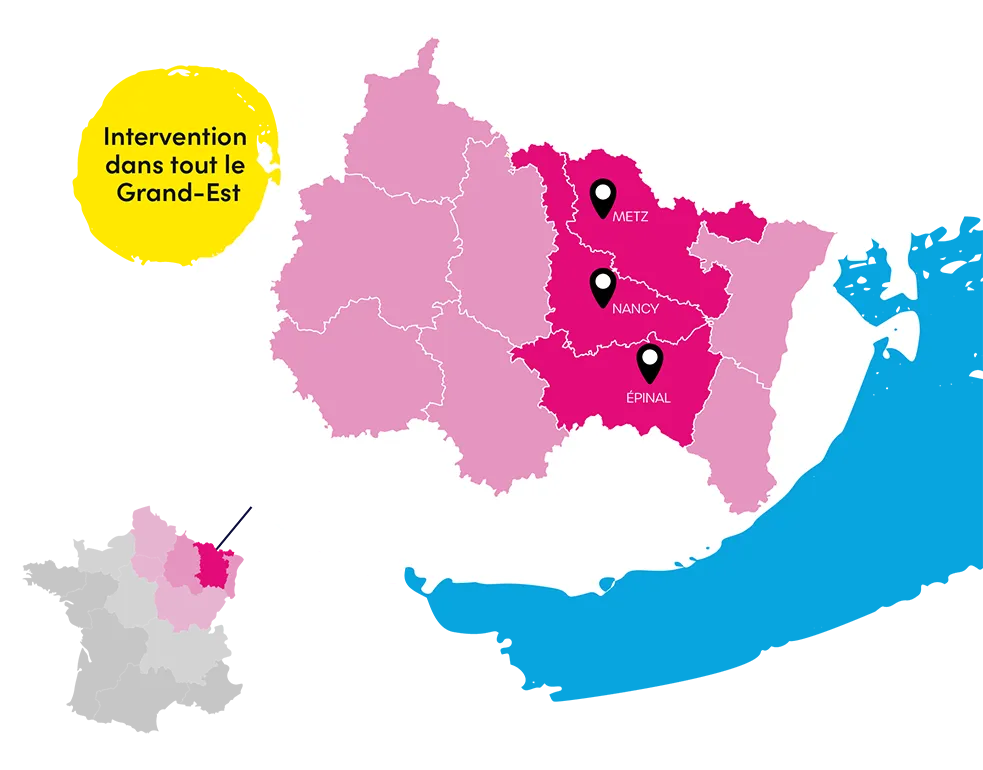Implantée à Épinal, Nancy et désormais à Metz, notre équipe intervient dans l’ensemble du Grand Est : Vosges (Saint-Dié-des-Vosges, Golbey, Charmes, Remiremont), Meurthe-et-Moselle (Lunéville, Toul) et Moselle.